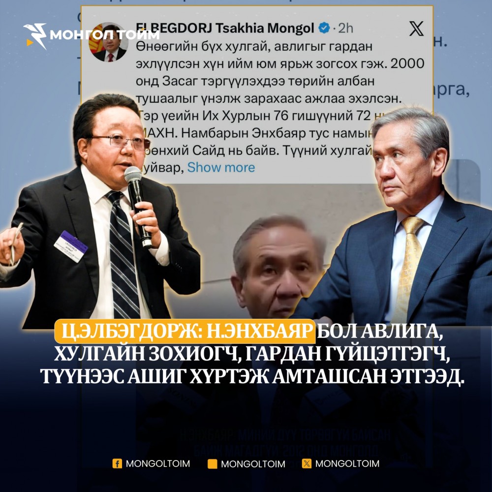 Ерөнхийлөгч асан Ц.Элбэгдорж Ерөнхийлөгч асан Н.Энхбаярыг монголын авлигын үндэс суурийг тавигч, төрийн албан тушаалыг зарагч хэмээн жиргэснийг бүтэн эхээр нь хүргэж байна. Тэрээр хэлэхдээ